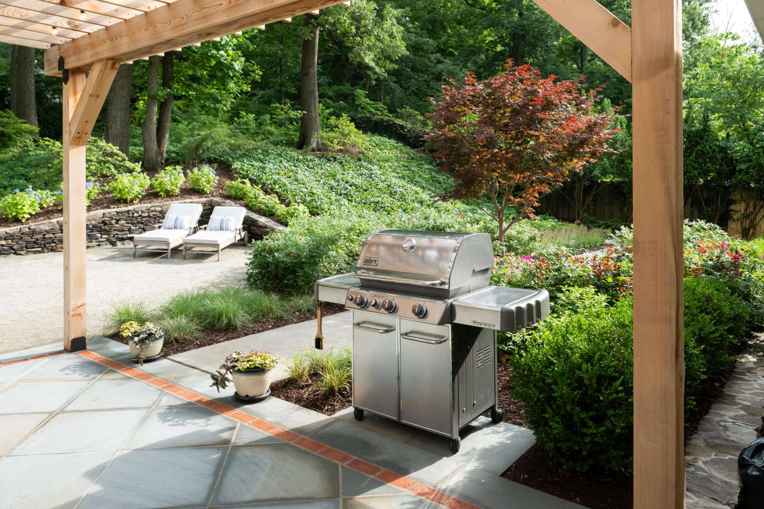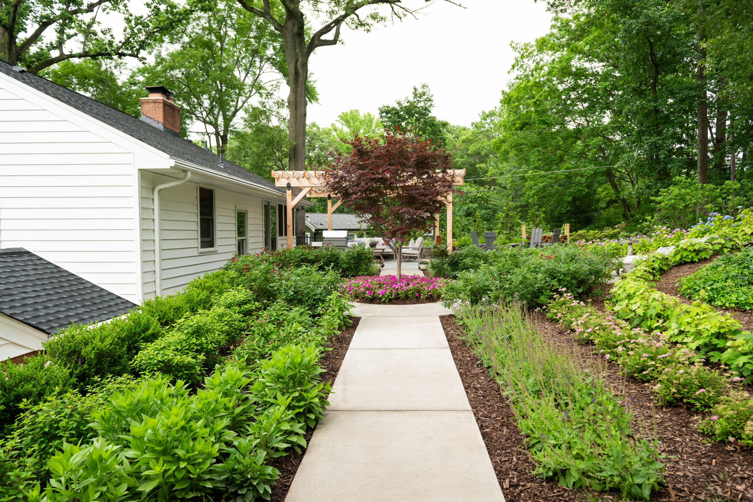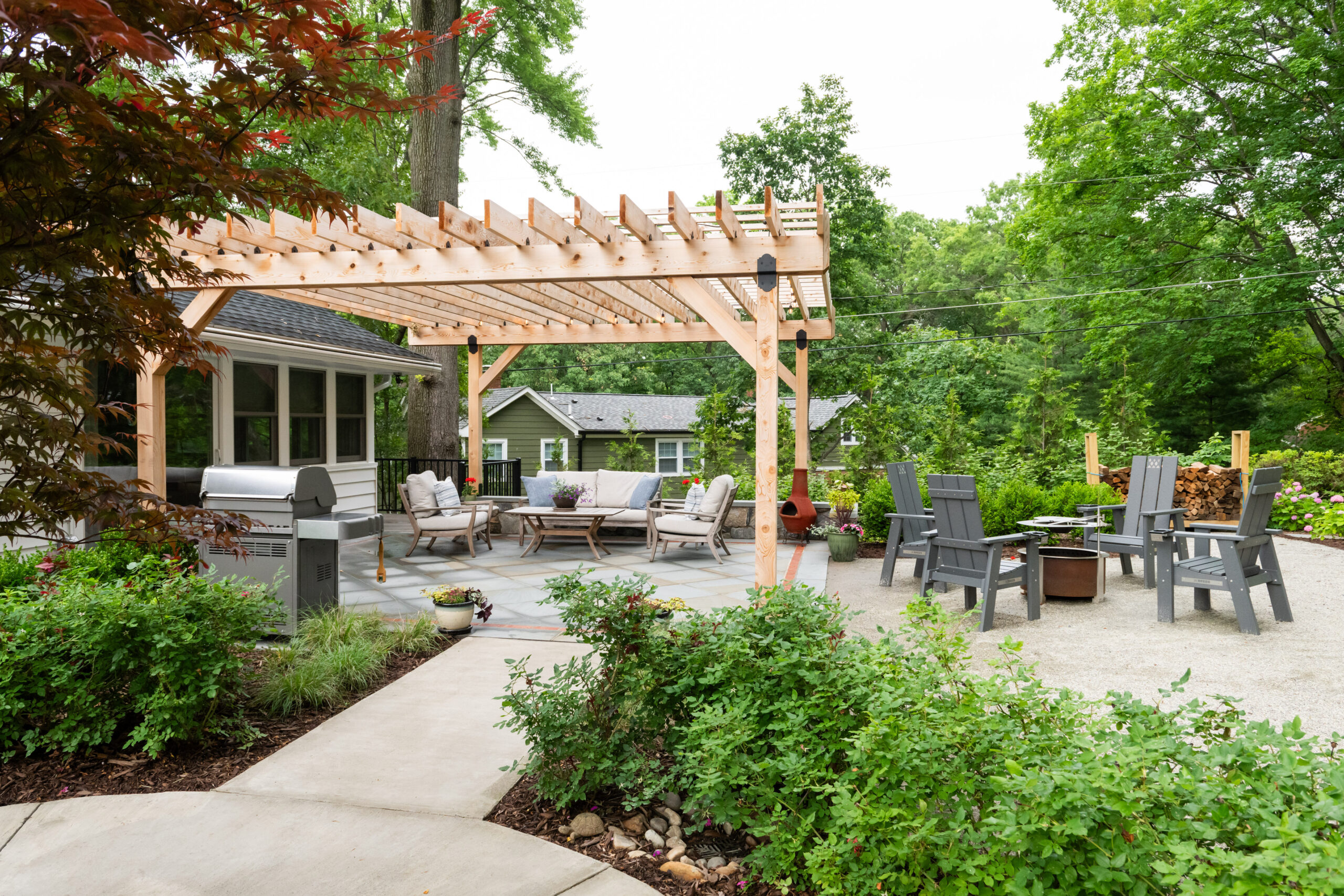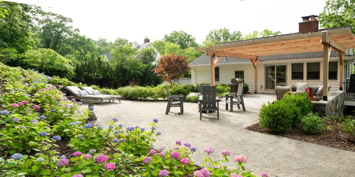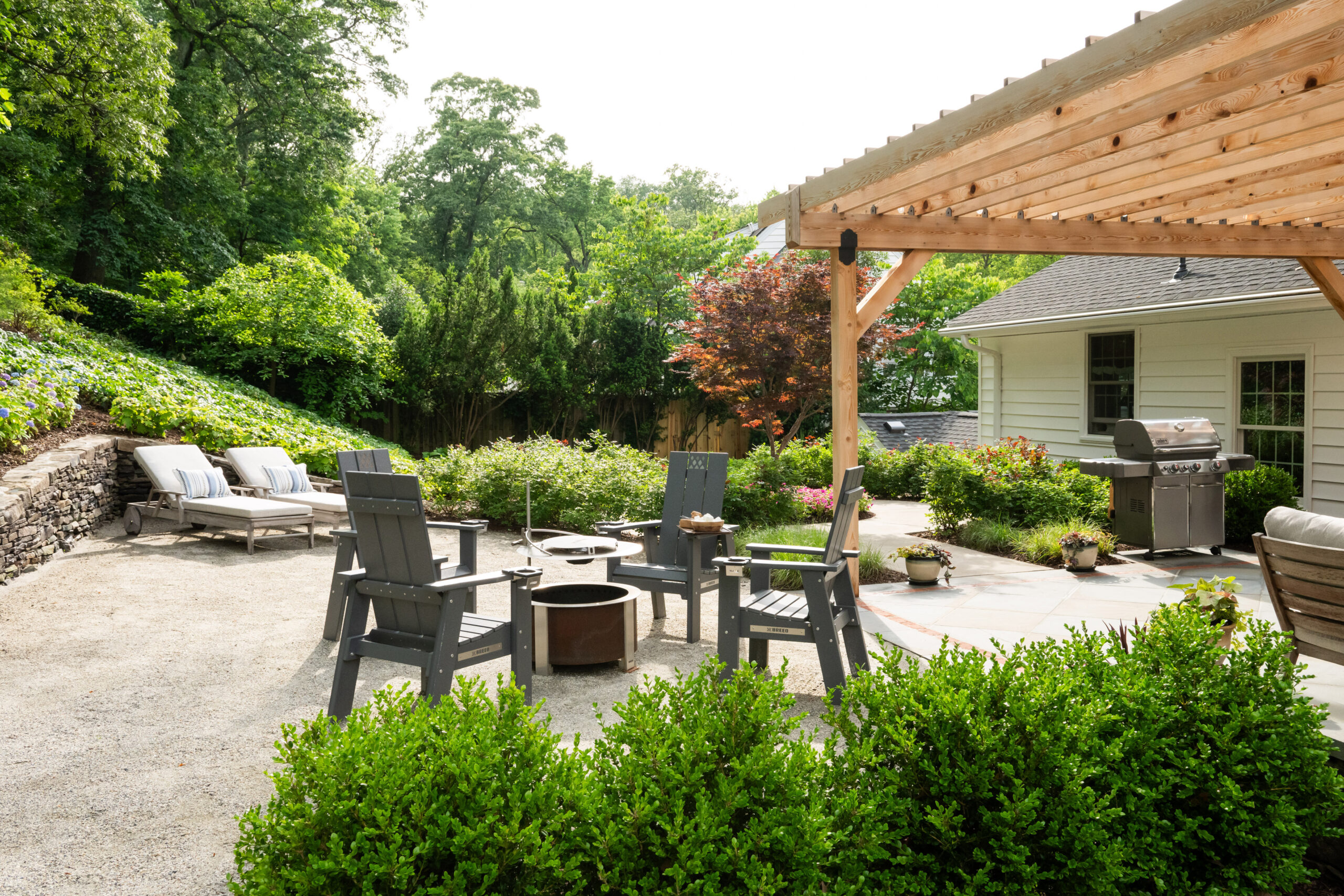 In Bell Haven, VA, this wooded property transformation proves that functional outdoor living doesn’t have to sacrifice natural beauty. What was once an underutilized woodland setting has been reimagined as a multi-zone entertainment haven that feels as if it emerged organically from the landscape itself. Stone walls and a warm cedar pergola define distinct outdoor spaces without disrupting the surrounding trees. The level pea gravel patio invites competitive corn hole matches and fireside conversations, while the intimate pergola area serves as a natural gathering spot for grilling, dining, and lounging. A magnificent Bloodgood Maple anchors the design as a living centerpiece, its stunning color providing a dramatic focal point that changes with the seasons. By thoughtfully integrating rustic materials that complement rather than compete with the existing landscape, this project creates a cozy woodland oasis perfect for couples’ game nights and evening entertaining. The result is a backyard that feels both cultivated and wild – a retreat where nature and hospitality converge in perfect harmony.
