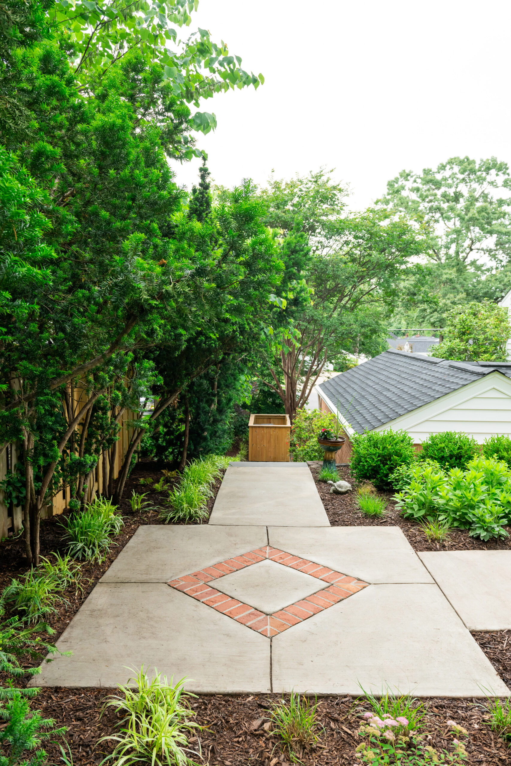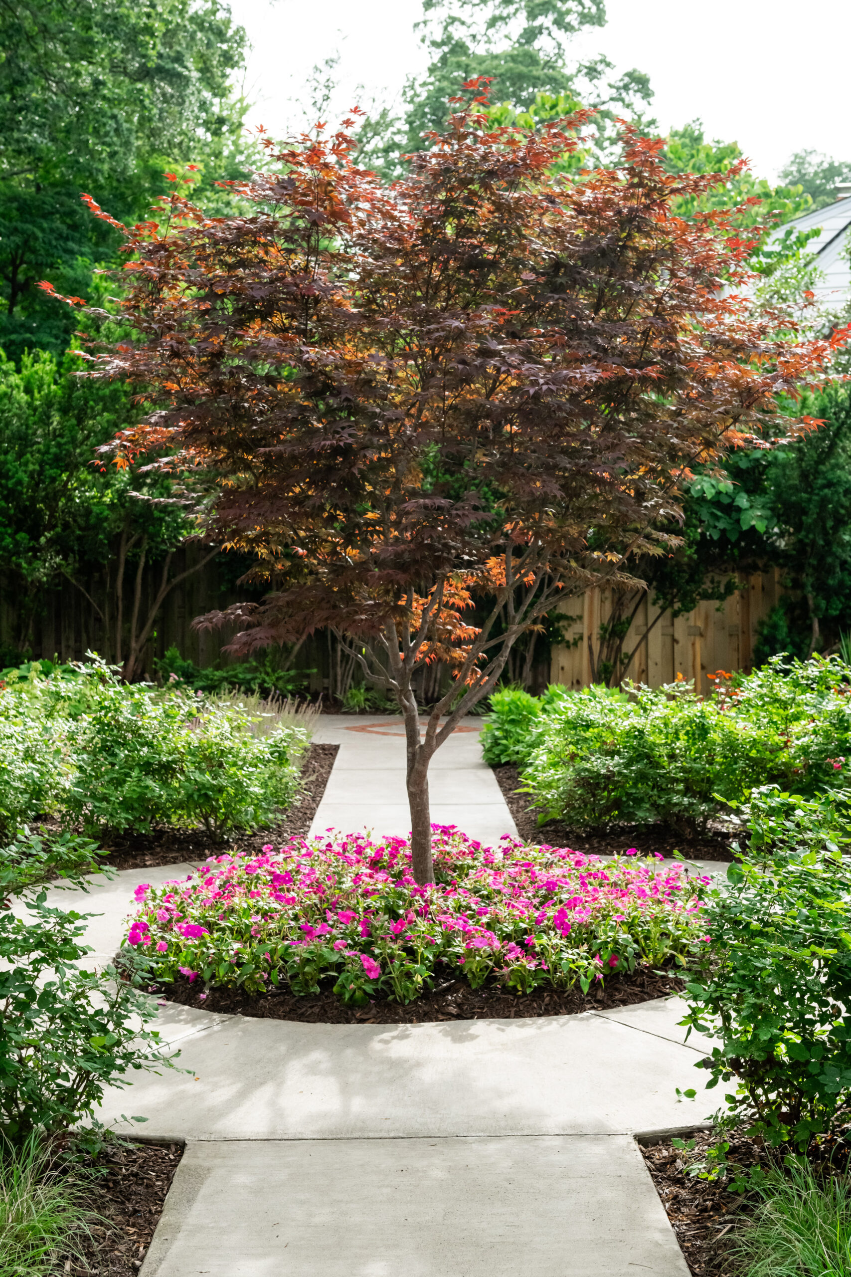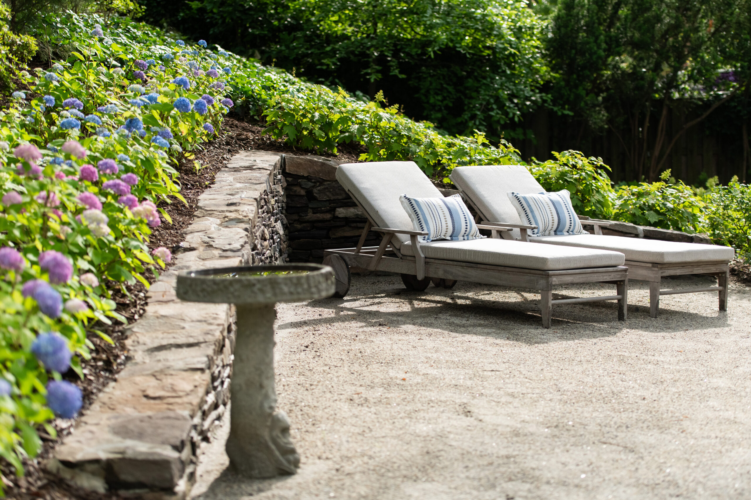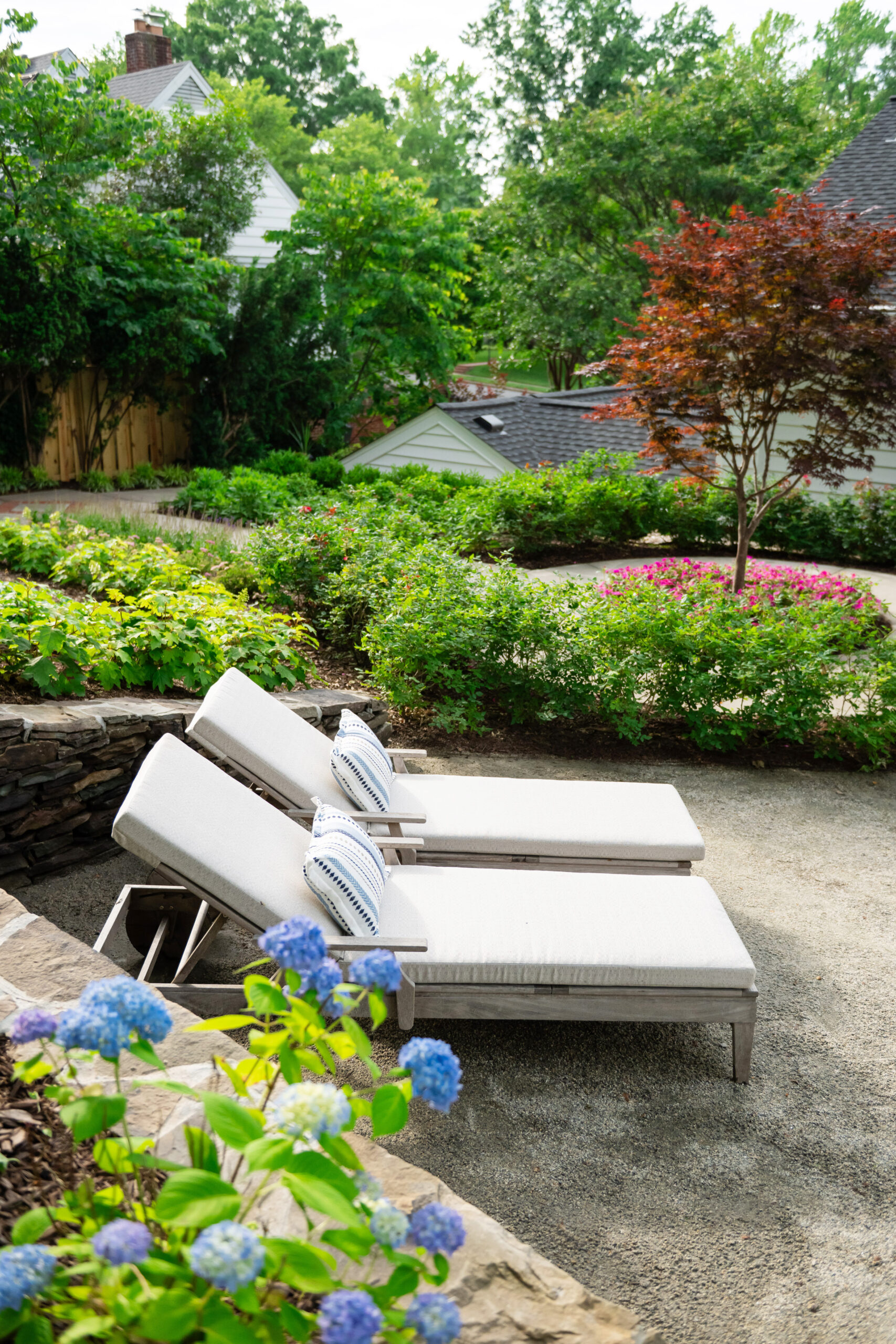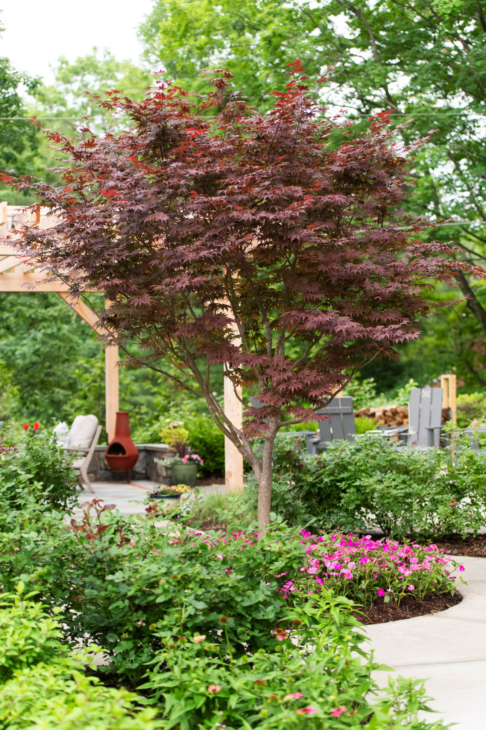 In Bell Haven, VA, this wooded property transformation proves that functional outdoor living doesn’t have to sacrifice natural beauty. What was once an underutilized woodland setting has been reimagined as a multi-zone entertainment haven that feels as if it emerged organically from the landscape itself. Stone walls and a warm cedar pergola define distinct outdoor spaces without disrupting the surrounding trees. The level pea gravel patio invites competitive corn hole matches and fireside conversations, while the intimate pergola area serves as a natural gathering spot for grilling, dining, and lounging. A magnificent Bloodgood Maple anchors the design as a living centerpiece, its stunning color providing a dramatic focal point that changes with the seasons. By thoughtfully integrating rustic materials that complement rather than compete with the existing landscape, this project creates a cozy woodland oasis perfect for couples’ game nights and evening entertaining. The result is a backyard that feels both cultivated and wild – a retreat where nature and hospitality converge in perfect harmony.
