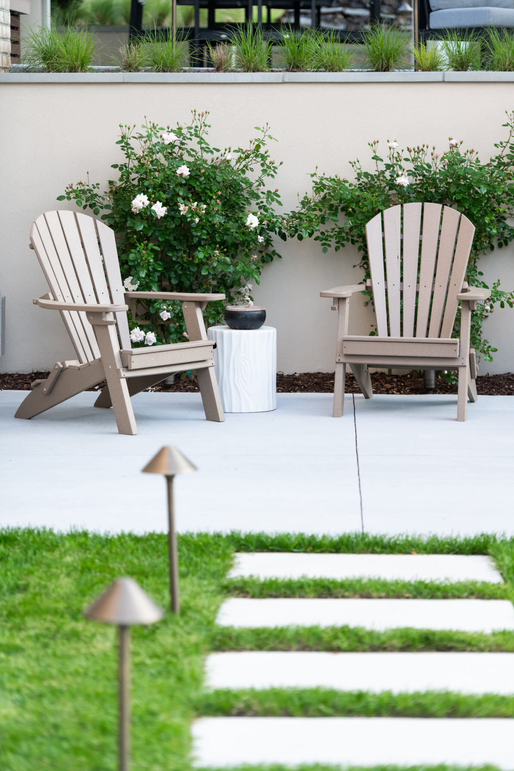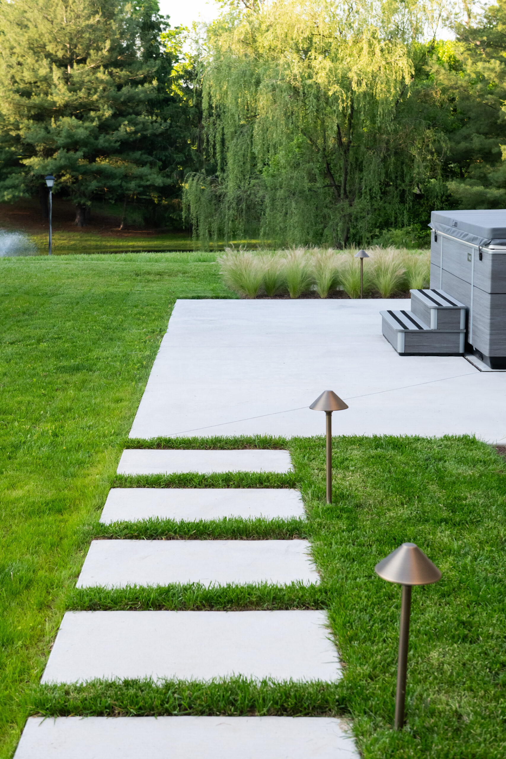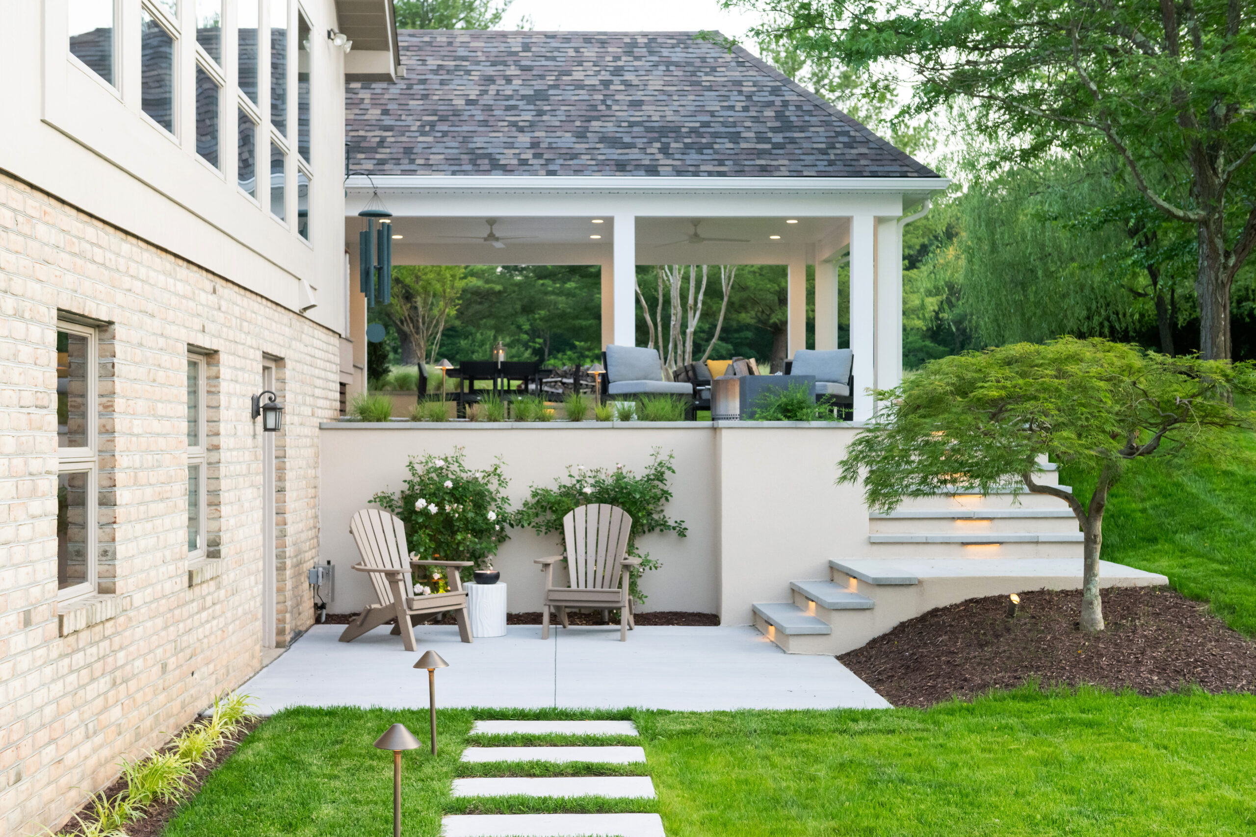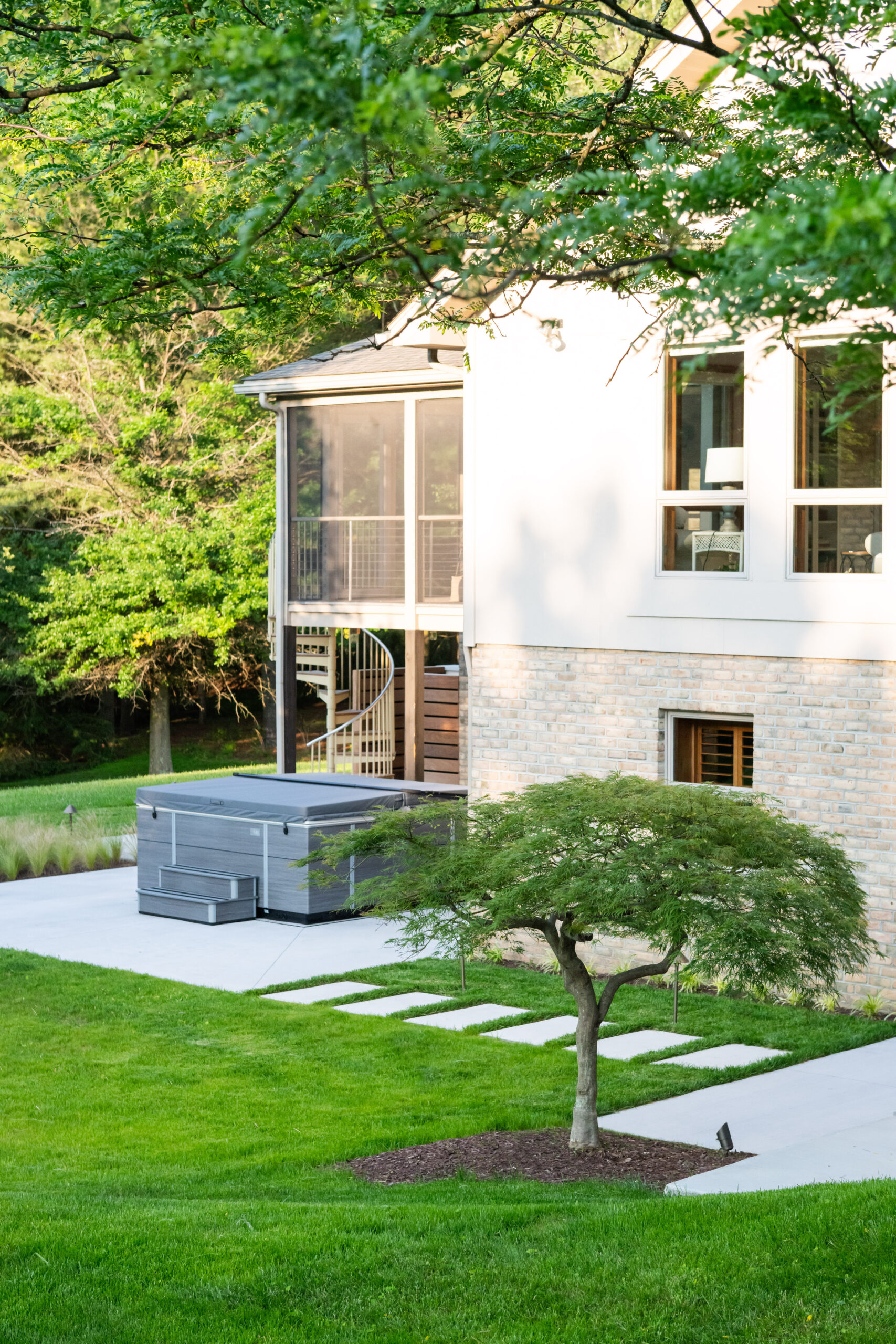 In Keedysville, MD, this hillside transformation marries West Coast modernism with East Coast tradition, creating a sophisticated retreat for empty-nesters that expands gracefully when family returns. Streamlined concrete patios replace dated pavers, while stucco walls with pre-cast concrete caps complement the home’s distinctive brick. Rich Ipe wood accents on deck skirting, spiral stair treads, and the outdoor shower add warmth against the clean backdrop. The multi-level design capitalizes on rolling hill views while creating natural zones – from quiet mornings in the hot tub (where even the local wildlife feels welcome) to family dinners on the patio to intimate evenings around the fire. Pre-cast concrete elements unify the varied materials into one cohesive vision. This is outdoor living that adapts to life’s changing rhythms, offering both serene simplicity and generous space for when children and grandchildren fill the hillside with laughter once more.