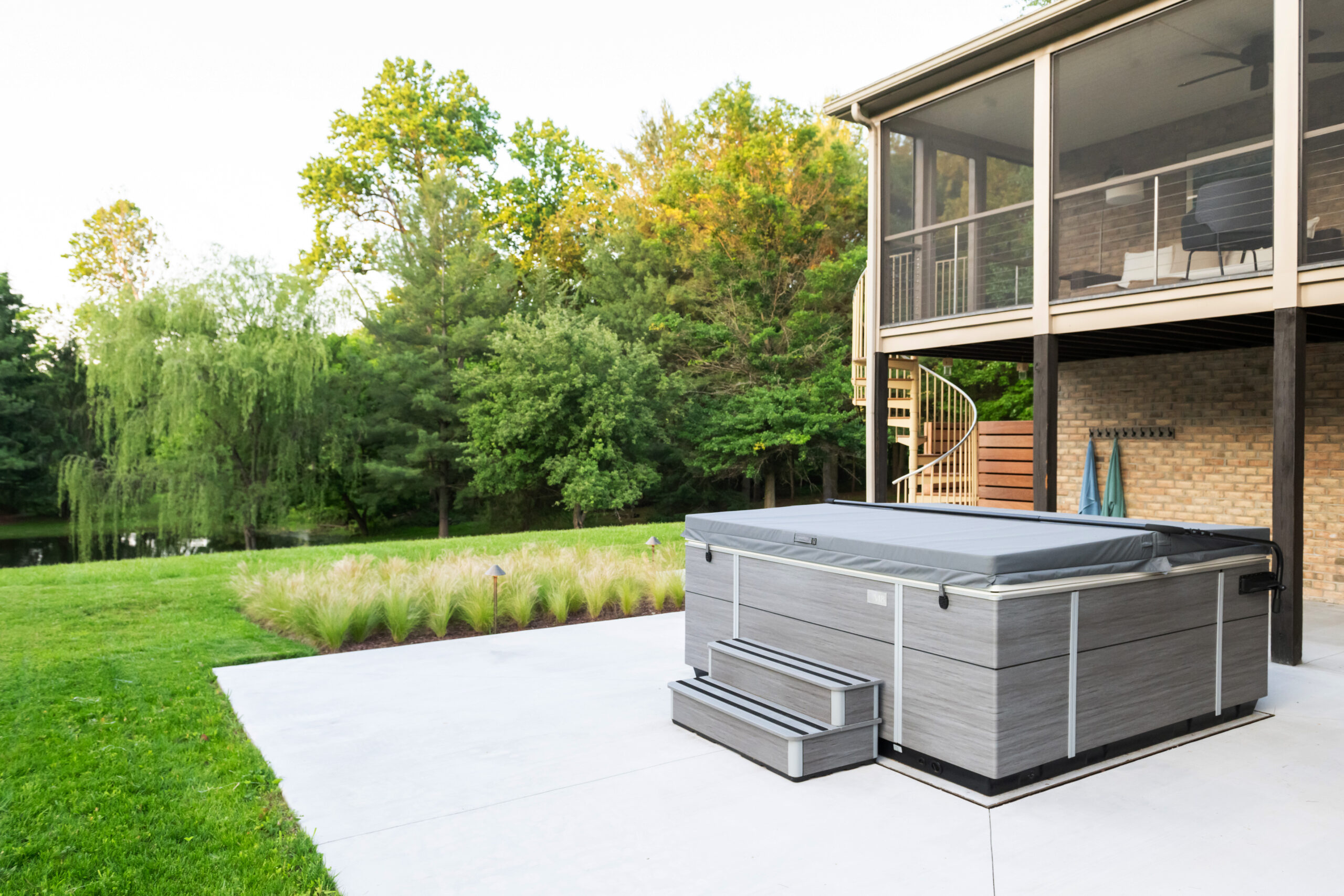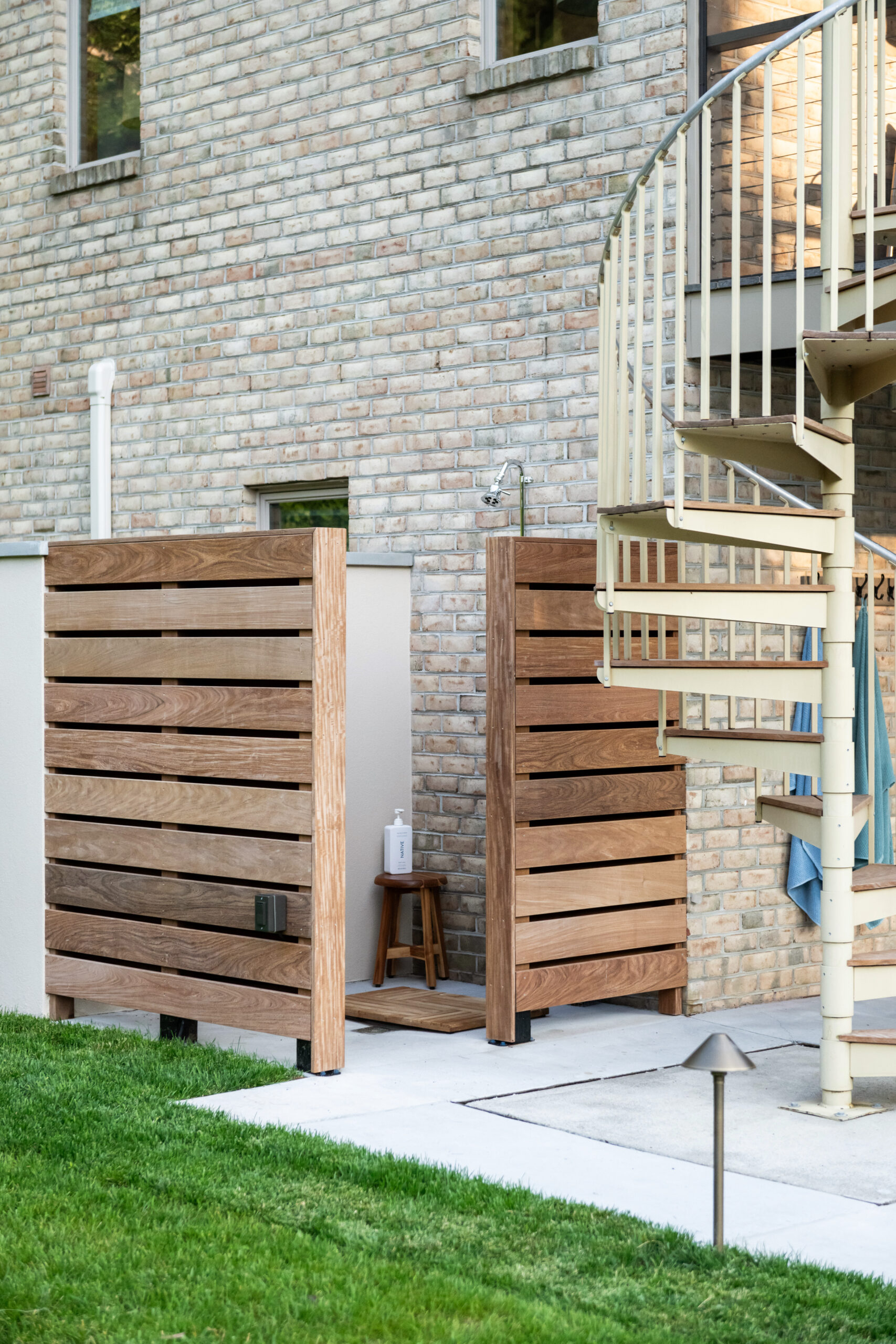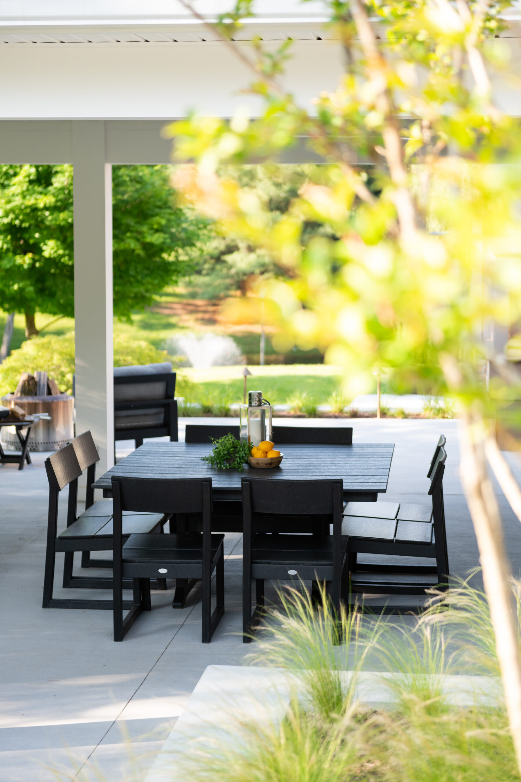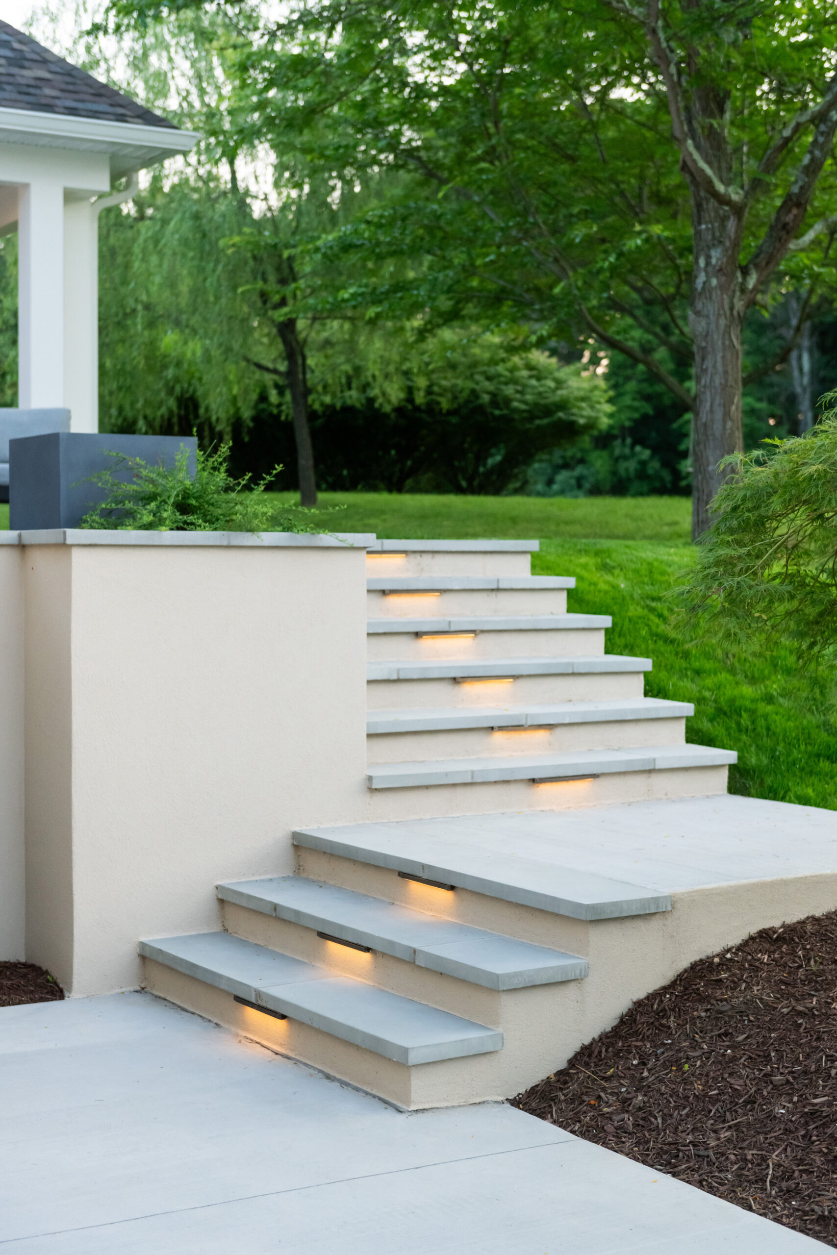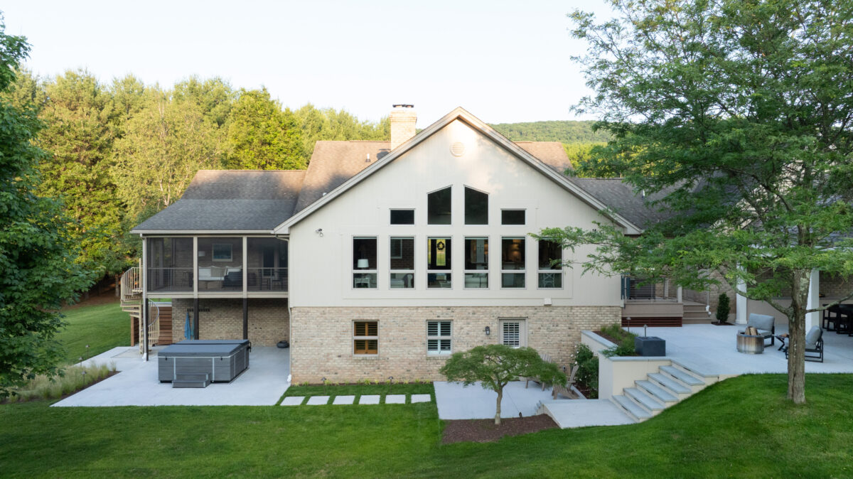 In Keedysville, MD, this hillside transformation marries West Coast modernism with East Coast tradition, creating a sophisticated retreat for empty-nesters that expands gracefully when family returns. Streamlined concrete patios replace dated pavers, while stucco walls with pre-cast concrete caps complement the home’s distinctive brick. Rich Ipe wood accents on deck skirting, spiral stair treads, and the outdoor shower add warmth against the clean backdrop. The multi-level design capitalizes on rolling hill views while creating natural zones – from quiet mornings in the hot tub (where even the local wildlife feels welcome) to family dinners on the patio to intimate evenings around the fire. Pre-cast concrete elements unify the varied materials into one cohesive vision. This is outdoor living that adapts to life’s changing rhythms, offering both serene simplicity and generous space for when children and grandchildren fill the hillside with laughter once more.