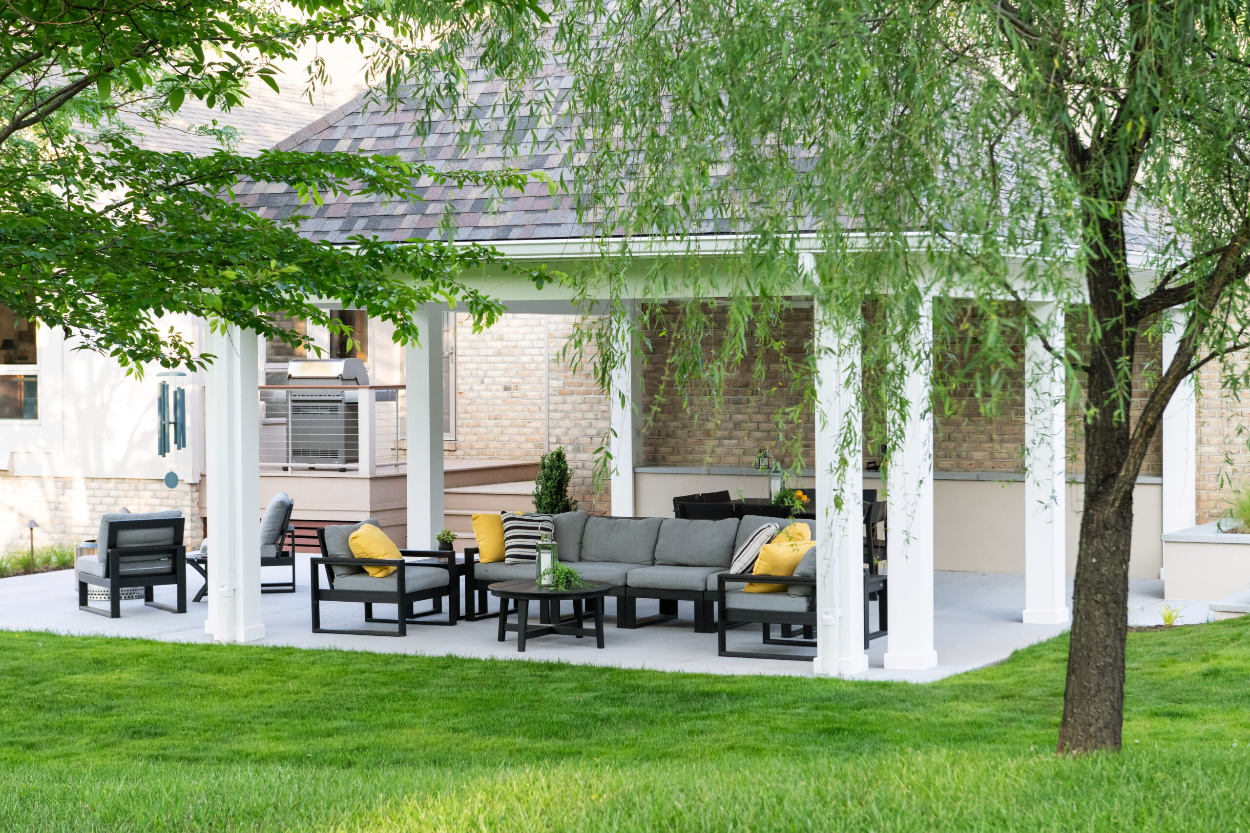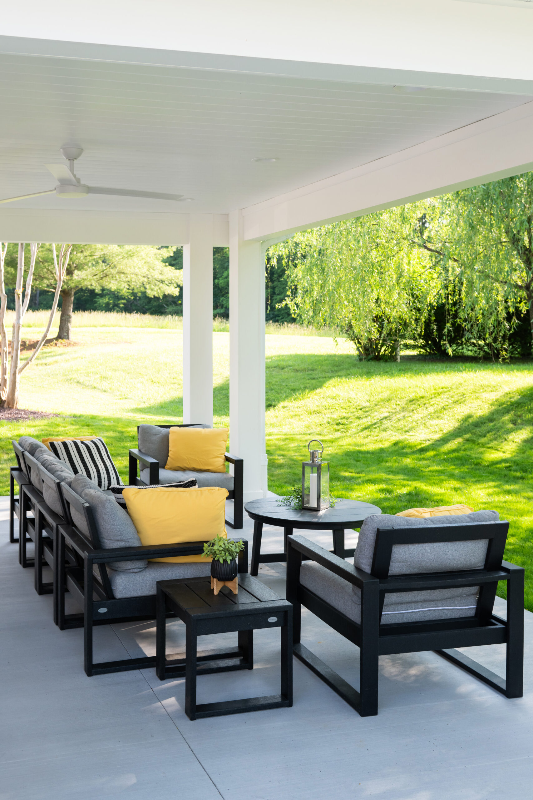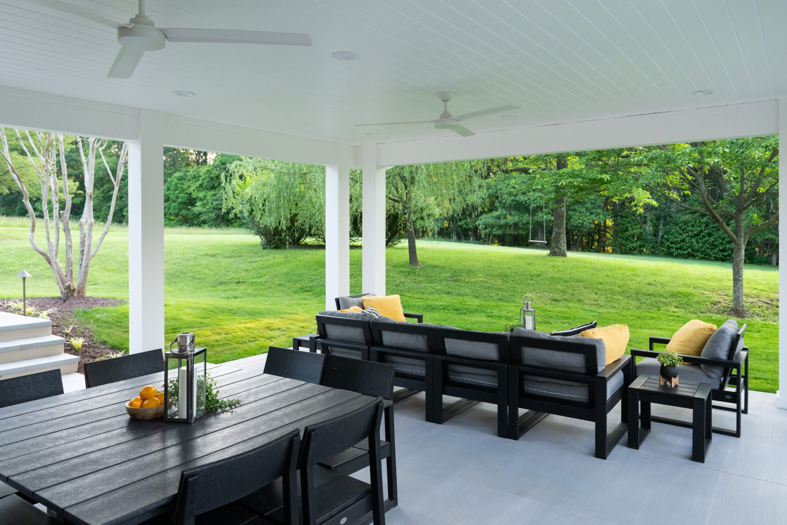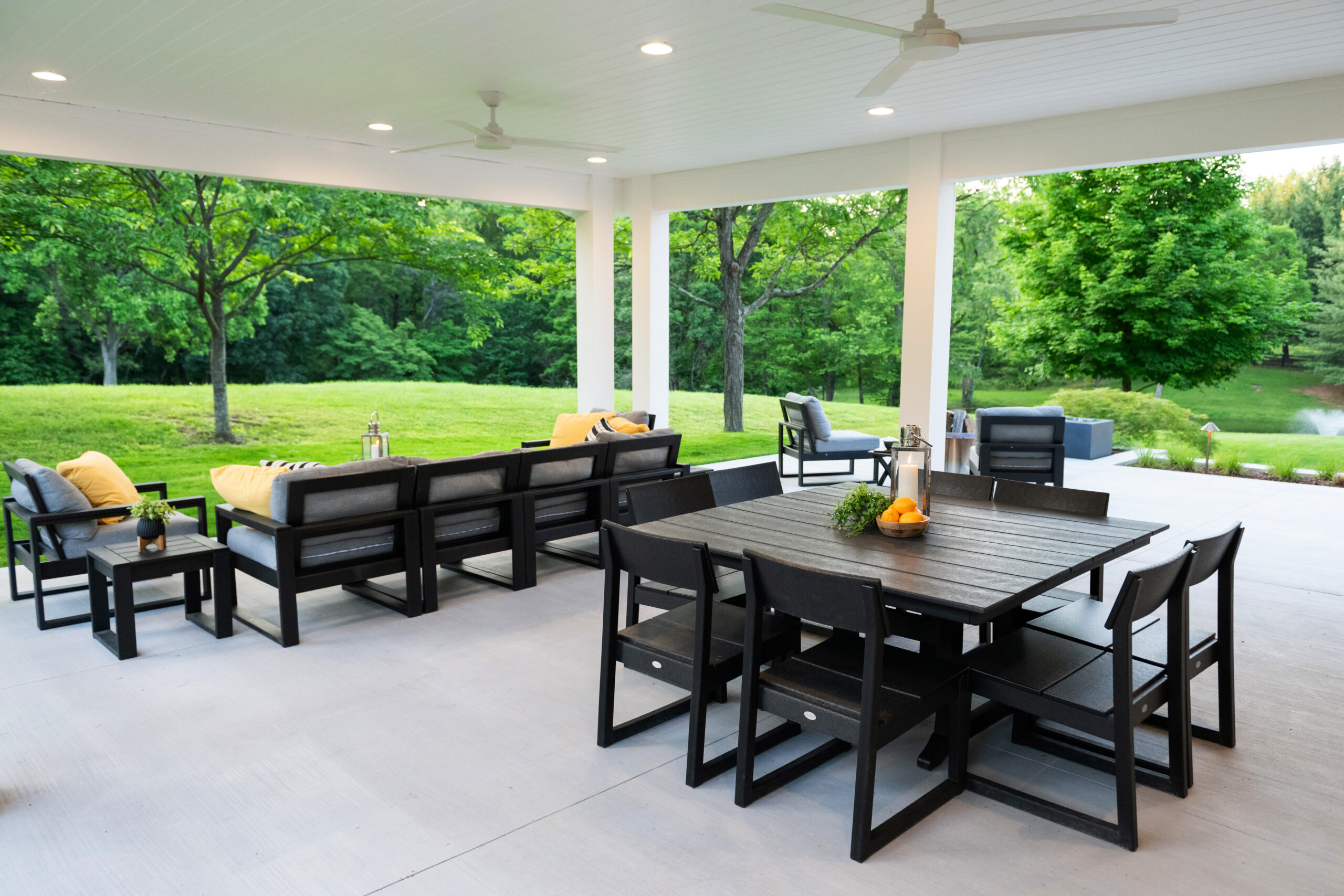 In Keedysville, MD, this hillside transformation marries West Coast modernism with East Coast tradition, creating a sophisticated retreat for empty-nesters that expands gracefully when family returns. Streamlined concrete patios replace dated pavers, while stucco walls with pre-cast concrete caps complement the home’s distinctive brick. Rich Ipe wood accents on deck skirting, spiral stair treads, and the outdoor shower add warmth against the clean backdrop. The multi-level design capitalizes on rolling hill views while creating natural zones – from quiet mornings in the hot tub (where even the local wildlife feels welcome) to family dinners on the patio to intimate evenings around the fire. Pre-cast concrete elements unify the varied materials into one cohesive vision. This is outdoor living that adapts to life’s changing rhythms, offering both serene simplicity and generous space for when children and grandchildren fill the hillside with laughter once more.